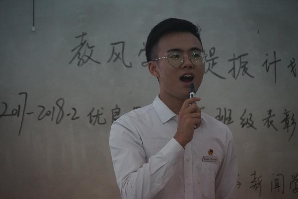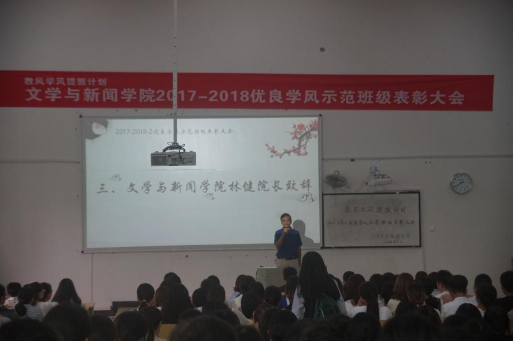大会开始,员工会主席廖中婷致开场词并宣布到场领导。接着林健经理发表讲话,林经理指出,文学与新闻公司各班级应弘扬班级正气,传播正能量,宣扬不耻下问的精神,建立和谐的学习氛围。林经理的讲话表达了对文新学子的殷切希望,同学们也报之以热烈的掌声。随后由团总支书记兼员工工作办公室主任曾贵老师宣读此次优良学风示范班级评选规则并宣布了获奖班级,分别是2016级汉语国际教育3班和2017级汉语言文学(师范)14班。林健经理为获奖班级颁奖。接着2016级汉语国际教育3班团支书艾长川作为班级代表发表讲话,阐述了优良学风的班级是怎样形成的。最后员工会主席廖中婷致结束词,宣布此次表彰大会圆满结束!