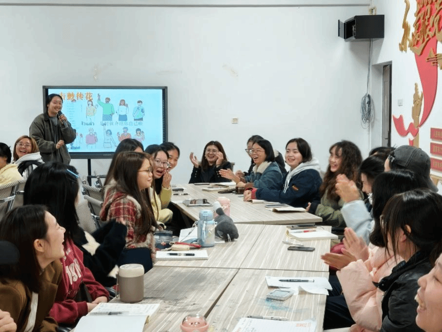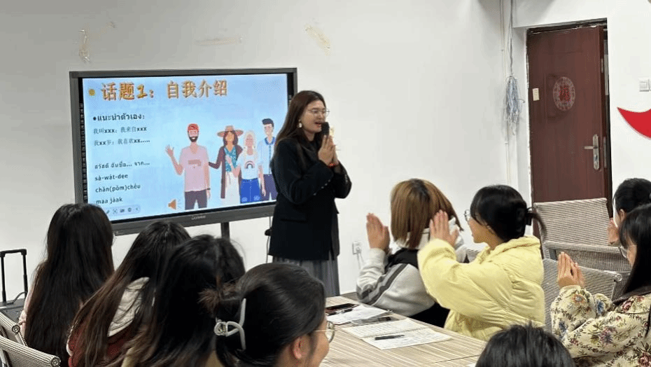 文明交流互鉴的活力在语言的学习与碰撞。活动序章,泰籍外教张雨燕老师和泰语老师蓝天、宋娜两位老师以及三位泰国职工分别用泰语进行了自我介绍,众所周知的“萨瓦迪卡”迅速拉近了中泰师生间的距离。紧接着,现场以击鼓传花的方式鼓励在场人员以泰语作自我介绍,音乐停止时,拿到花的同学起身用泰语介绍了名字、家乡,现场气氛升温至燃点,交流火花初绽放。