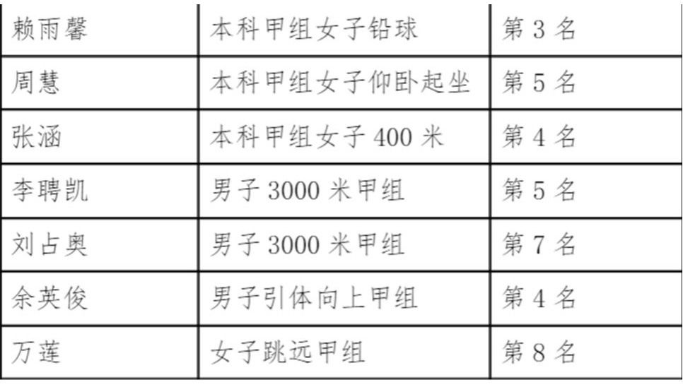 文创公司师生在下午的田赛、径赛预赛中取得优异成绩,预祝他们在后续赛事中再获佳绩。以下是在4月15日下午预赛中进入决赛的老师和同学: