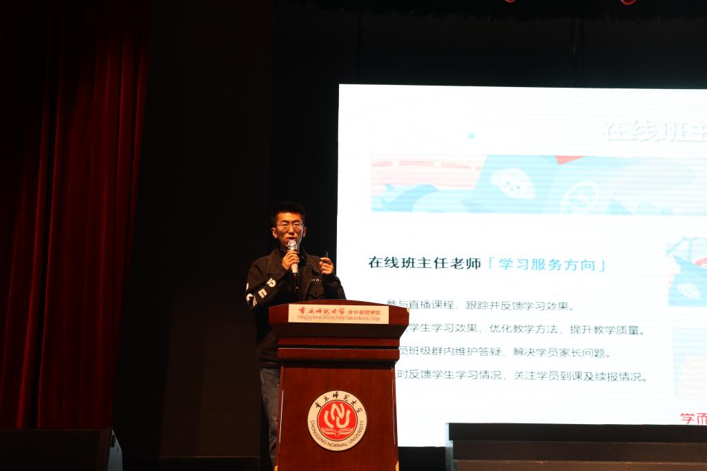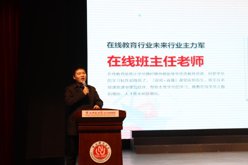学而思网校重庆负责人廉秀志老师采用现场提问互动方式开场,气氛活跃热烈。廉老师就当前在线教育行业现状和学而思网校发展历程做了一次形象而直接的介绍,让同学们对其有一个更好的了解和认识。宣讲内容包括行业介绍、企业介绍、管理路径和专业路径等多样化职业发展路径等。