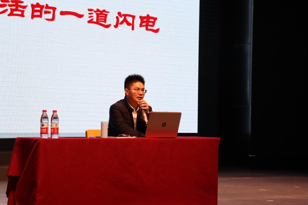 谈及“名家”时,徐庶教授得到业界的一致好评——著名作家、中国作家协会书记处书记邱华栋评价“近年来,徐庶的诗歌创作异军突起,是重庆诗人中的佼佼者”,著名诗人、《诗林》主编潘红莉评价“徐庶的诗,是经过洗练的”………;什么是“文学”?徐庶教授解释道,“文学是人学,它关注人的命运、情感和生存状态”;通过讲述王蒙学者的“别人重情节,我重生活、写情绪、最后才重故事情节”观点,徐庶教授对“青春+文学”进行了论述;而“科普文学”,着重通过文学作品形式,普及科学知识;而“诗歌写作”,本质是抒情,关键要把握“语、辞、反、细、虚、情”六要素。通过讲文学创作与自己的亲生经历相结合,徐庶教授绘声绘色向同学们科普了文学创意写作知识。