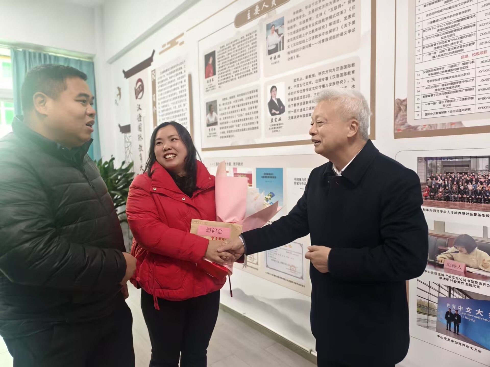 图为孙泽平董事长(右一)、梁修昌部长(左一)与胡梦娜老师亲切交谈