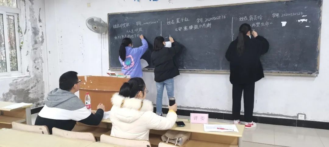 中午12:40,复赛在2103和2105两个教室同时进行。每个教室以3个参赛选手为一组,共五组。考题内容现场抽取,限时5分钟。评委老师将从笔法、字法、章法、书写规范和书写效果五个方面进行评分。比赛如火如荼的进行着,参赛选手全神贯注,不急不躁,一笔一划地认真书写。一行行字体,洒脱大气、飘逸舒展、行云流水。一份份作品表现了公司对师范生粉笔字技能的重视,同时也体会到了同学们对粉笔字的热情。在紧张而愉悦的氛围中,同学们锻炼了的胆量,陶冶了情操,提高了师范生的基本技能。