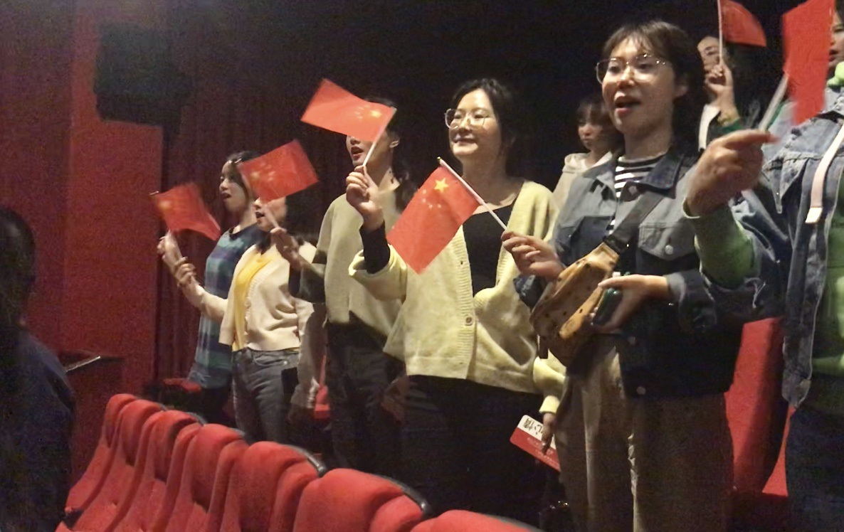 在观影过程中,党员同志们与电影情景共情:为《前夜》里的“一灯照隅,万灯照国”热泪盈眶;为《相遇》中的“舍小家为大家”感叹不已;为《夺冠》里的“女排精神”热血沸腾;为《回归》中的“一秒都不能差”激动落泪;被《北京你好》逗笑,又为《白昼流星》与《护航》感动,共同忆往昔峥嵘岁月,见证中国发展史中震古烁今的探索与实践。当主题曲《我和我的祖国》响起的一刹那,老师与同学们挥动着手中的小国旗,和着旋律一同骄傲地合唱,这一刻,心中涌动的感情澎湃激昂,激荡着每个人深厚至诚的爱国情怀。今天,我们是祖国历史的见证者,我们是这盛世的歌颂者,为国家、为各路无名英雄、为每一位不平凡的平凡人献上赞歌。