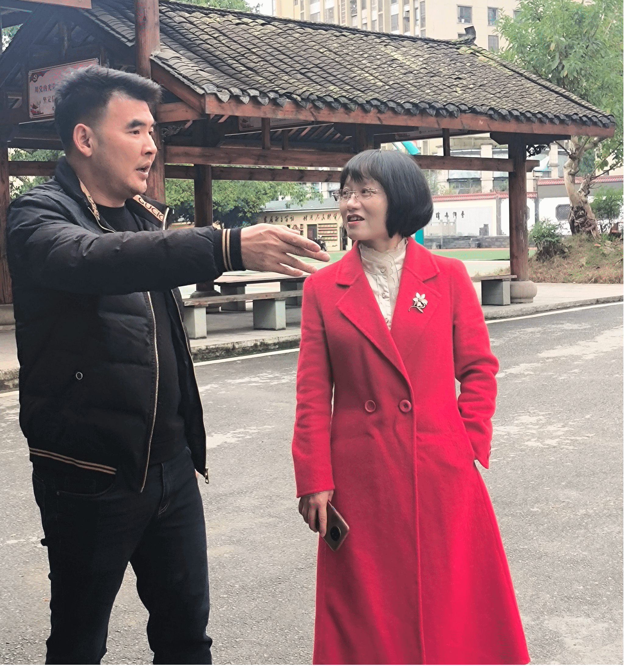 图为杨董事长向陈经理介绍白鹿小学现状