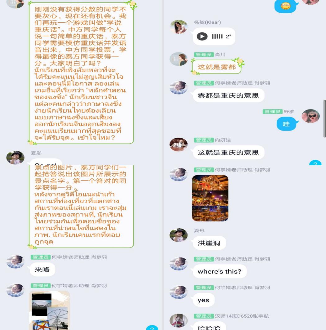 伴随着有趣的线上视频通话,主题活动正式拉开帷幕。国际交流与合作中心成员肖川和肖梦羽通过中泰文语音展示活动流程,随后以一个介绍重庆的总视频,带着大家走进这座“人杰地来灵之城,美丽麻辣之都”。紧接着,中心成员们充当小导游依次发送介绍重庆解放碑,洪崖洞,长江索道,磁器口等具有当地特色的景点与美食视频,展现重庆之美。泰国职工们热情高涨,纷纷表示非常向往来到这座美丽的山城。随后在“景点猜猜猜”“学说重庆话”的游戏互动环节,大家踊跃参与,激趣畅谈,品味巴渝的文化与人情。