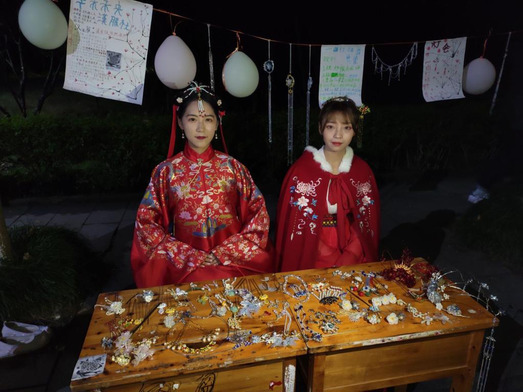 由汉服社带来的歌舞表演拉开了灯会序幕,“舞凤髻蟠空,袅娜腰肢温更柔。轻移莲步,汉宫飞燕旧风流。”月下的女子们时而抬腕低眉,时而轻舒云手,手中扇子合拢握起,似笔走游龙绘丹青,玉袖生风,典雅矫健。乐声清泠于耳畔,手中折扇如妙笔如丝弦,转、甩、开、合、拧、圆、曲,流水行云若龙飞若凤舞,如此佳景让同学们热情澎湃,呼声不断。舞曲表演结束,活动正式开始,围在灯谜下的同学们,摘下了虎视已久的灯谜条,奔向兑奖处。