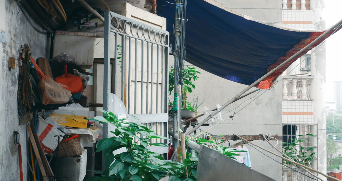 狭窄的小巷胡同,几株爬山虎探头下来,一栋老旧的居民楼藏在闹市后面,这里是双南路29号。李彩秀奶奶和她老伴黎松柏爷爷住在这栋带着岁月情怀的居民楼里。阳台外是用一整片塑料拼接而搭成的简陋雨棚,雨棚下挂着老人的衣服;阳台里的角落分成两半,一边堆积着捡来的废品,一边种着青椒、小青菜和小葱。夫妇俩的家很简陋,但是这个看似清贫的家,却处处透露着爱与温暖。小厨房紧挨着阳台,爷爷在厨台上择菜时,奶奶就带着小曾孙坐在门口哼唱童谣,夫妇俩偶尔目光相触,眼中全是对方。这大概就是书中所说,“入目无别人,四下皆是你。”夫妇俩人对话时慢慢悠悠的语调似乎一下子把人带回“从前日色慢、车马慢,一生只能爱一个人”的时代。