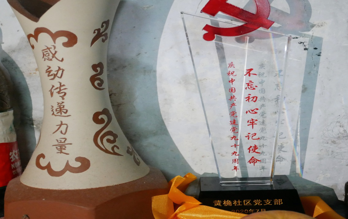 他们之间不单单只是爱,还有守望。在房间角落的柜子上有两座奖杯,一座上面印着“不忘初心,牢记使命”,一座上面印着“感动传递力量”,这是夫妇俩28年来默默守望的“证书”。1992年,李彩秀奶奶一次机缘巧合之下每月开始免费为刚刚新建的老碗厂敬老院的老人理发。在第五年的时候,黎松柏爷爷因为心疼老伴,开始学习研究理发技术,每月陪着李奶奶一起去为老人理发,而这一陪就是28年。谈及初衷,他说:“她想去守望这个世界,我心疼她,所以我想去守望着她。”从不惑之年到到古稀岁月,他一直守望着她。这匆匆几十年改变了很多东西,老碗厂敬老院改名为夕阳红敬老院,小镇也从落后的地区变为“科技林立扎篱笆”的经开区,但是夫妇俩“守望”的初心却一直未变。这个世界川流熙攘,他们藏身于时间角落,用自己的方式守望着彼此,守望着世界。