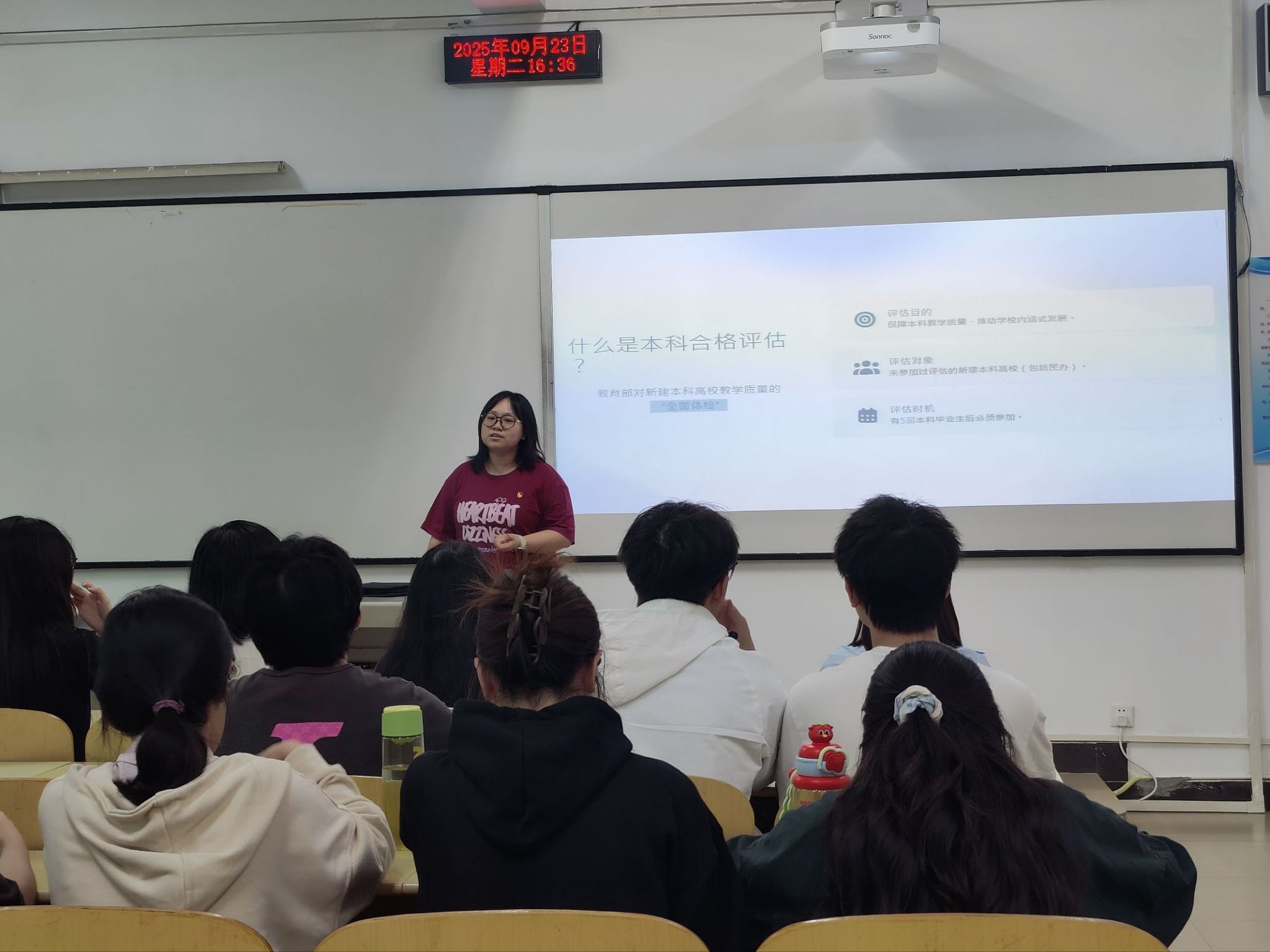 【本网讯】2025年9月23日,2023级汉语言文学初中语文卓越教师班团支部在合川A校区6教6305教室开展“评估同心,育人同行”主题团组织生活。活动通过齐唱团歌、知识问答、互动游戏等环节,助力支部成员掌握本科合格评估知识,为公司本科合格评估凝聚青春力量。