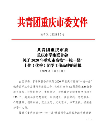 喜报——公司荣获2020年重庆市高校“一校一品”优秀团学工作品牌