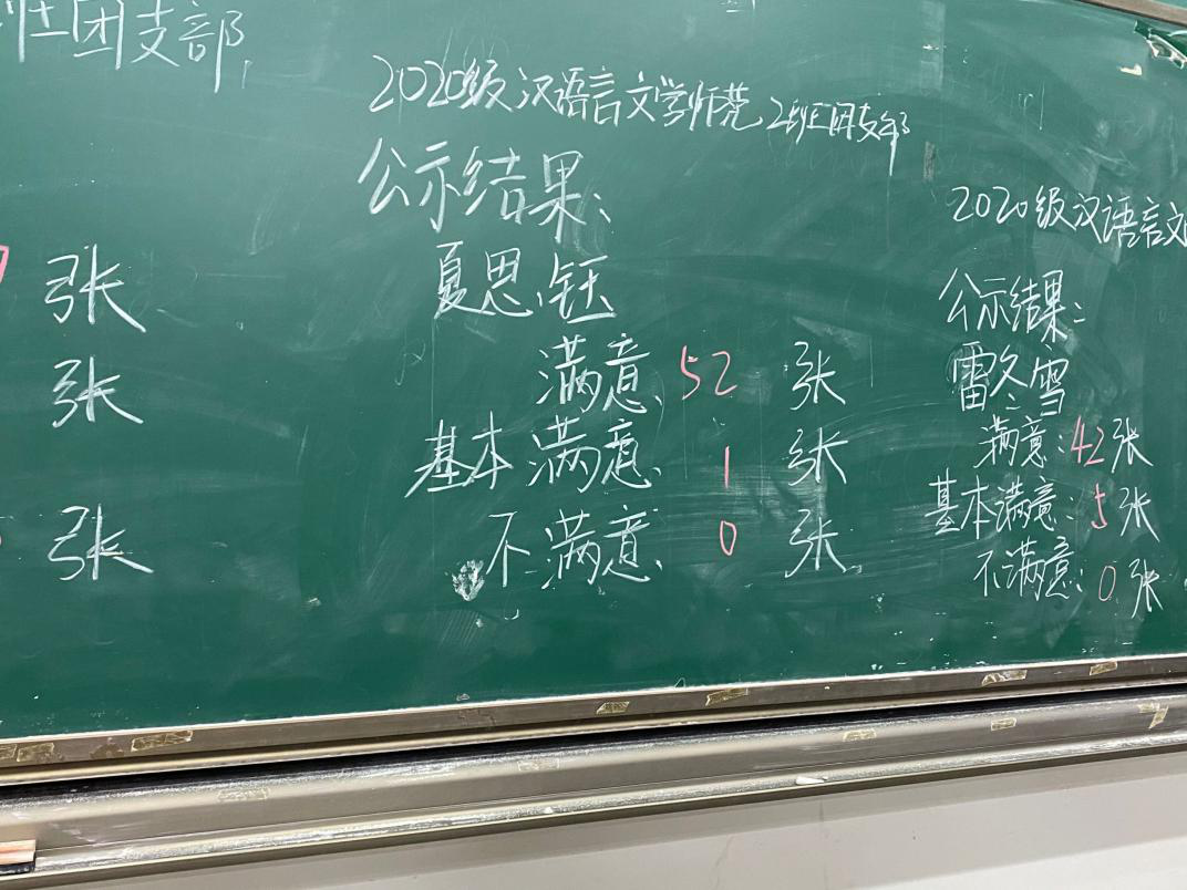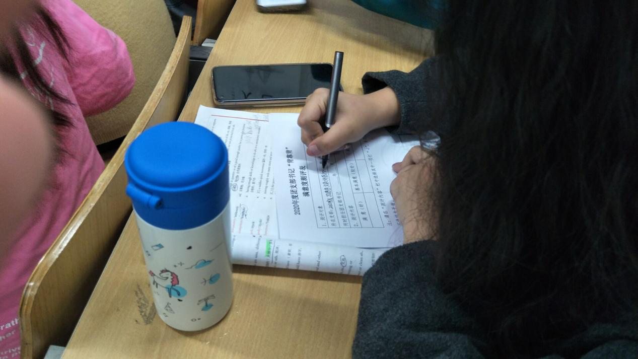 支部成员对该支部团支书进行现场满意度测评。此次测评采取“背靠背”无记名填写测评票的方法,分为“满意、基本满意、不满意”三个等次对团支部书记进行评价,参会的支部成员都严格地按照测评工作的要求对团支书进行了客观、公正的评价。