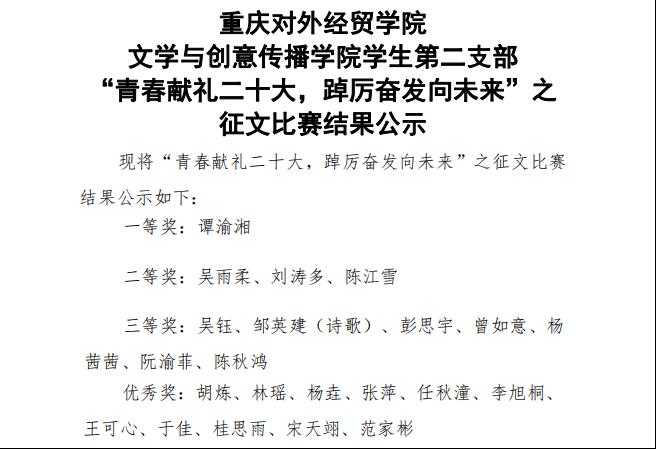 “青春献礼二十大,踔厉奋发向未来”之征文比赛于2023年5月17日下午在合川A校区6107评委通过选手提交的文章直接进行。最终评选出一等奖1名、二等奖3名、三等奖7名、优秀奖11名。