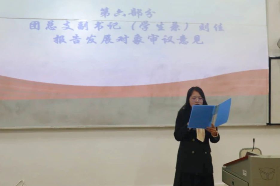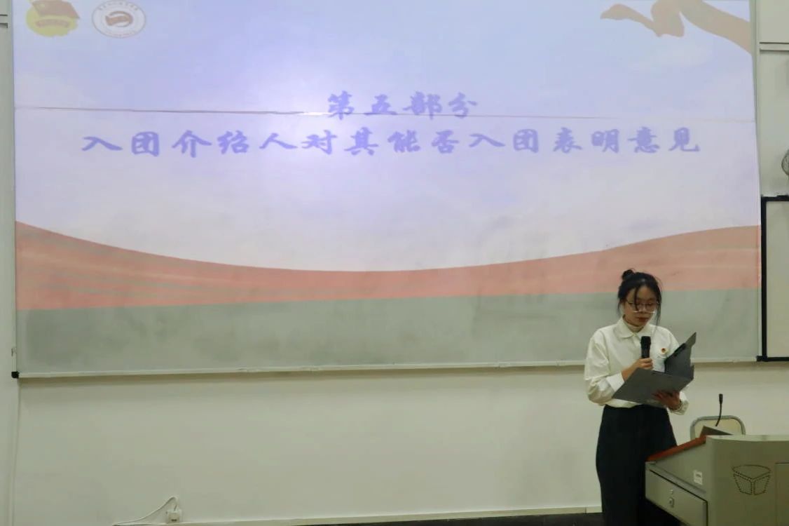 新发展团员名单宣读完毕后,进行大会第四项议程,由播报员播报31名新发展团员们的个人情况。随后进行大会第五项议程,入团介绍人代表袁鑫同学对其能否入团表明意见,同意为以上31名发展对象介绍入团。