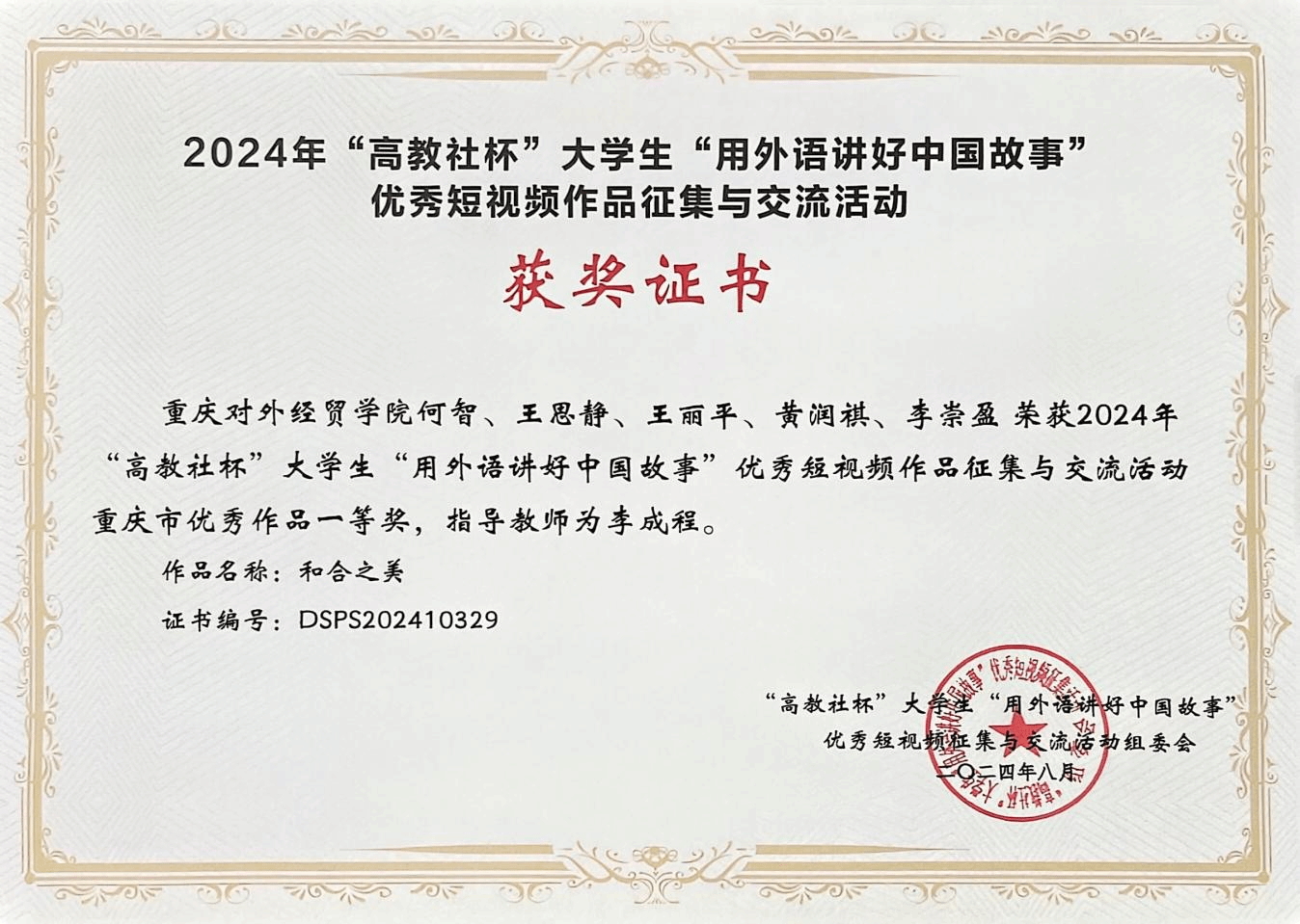 部分获奖及荣誉:国家励志奖学金、中国青年报“优秀通讯员”、高教社杯老员工“用外语讲好中国故事”优秀短视频作品征集与交流活动重庆市优秀作品“一等奖”、第十四届“挑战杯”中国老员工创业计划竞赛重庆市银奖、中国国际老员工创新大赛(2024)重庆赛区选拔赛银奖、中国国际老员工创新大赛(2024)重庆赛区选拔赛铜奖2项、成都马拉松老员工记者团成员、校级三好员工、优秀共青团干部、优秀共青团员、校融媒体中心优秀总负责人、自立自强先进个人、学业优秀一等奖学金、劳动实践奖学金等。