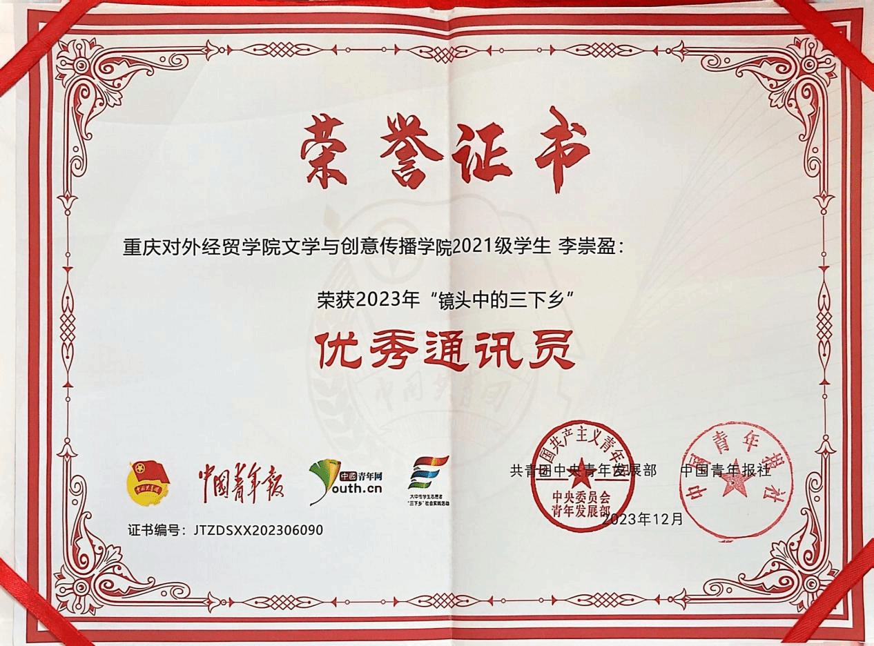 个人简介:李崇盈,女,汉族,四川达州,2002年5月出生,先后在华龙网、中国青年报•中国青年网、合川区融媒体中心、中共重庆市合川区委宣传部等单位实习,目前为中国青年网编辑部成员,中国青年报•中国青年网实习期间综合考核评定为“优秀”(大二、大三实习期间均被评为“优秀通讯员”);校内曾担任党委宣传部校融媒体中心总负责人、校团委宣传部负责人、《贸院高智商》公众号运营组组长。参与成都日报“C919”相关报道,曾被学习强国、光明日报、市说新语、中国教育电视台报道。