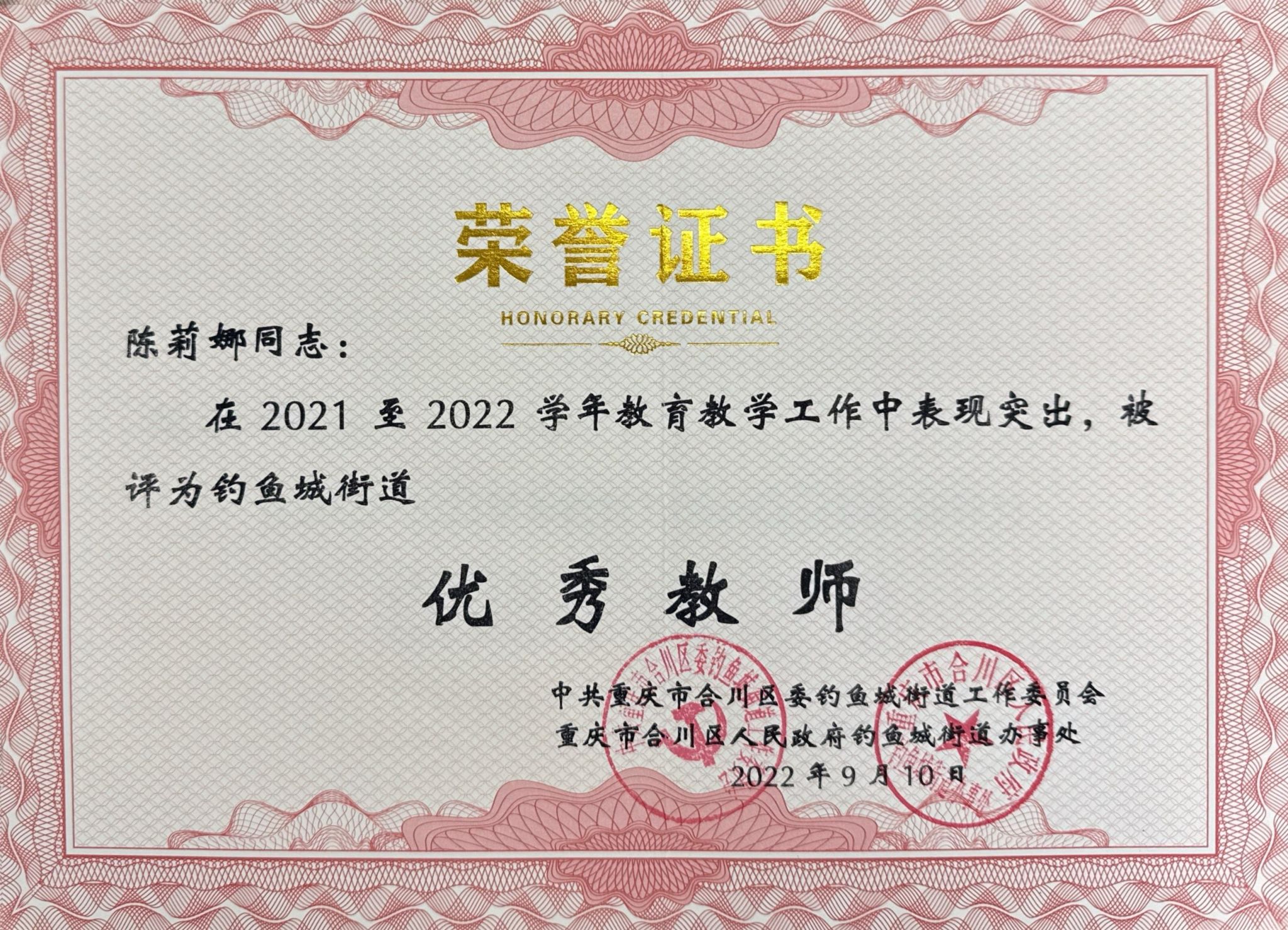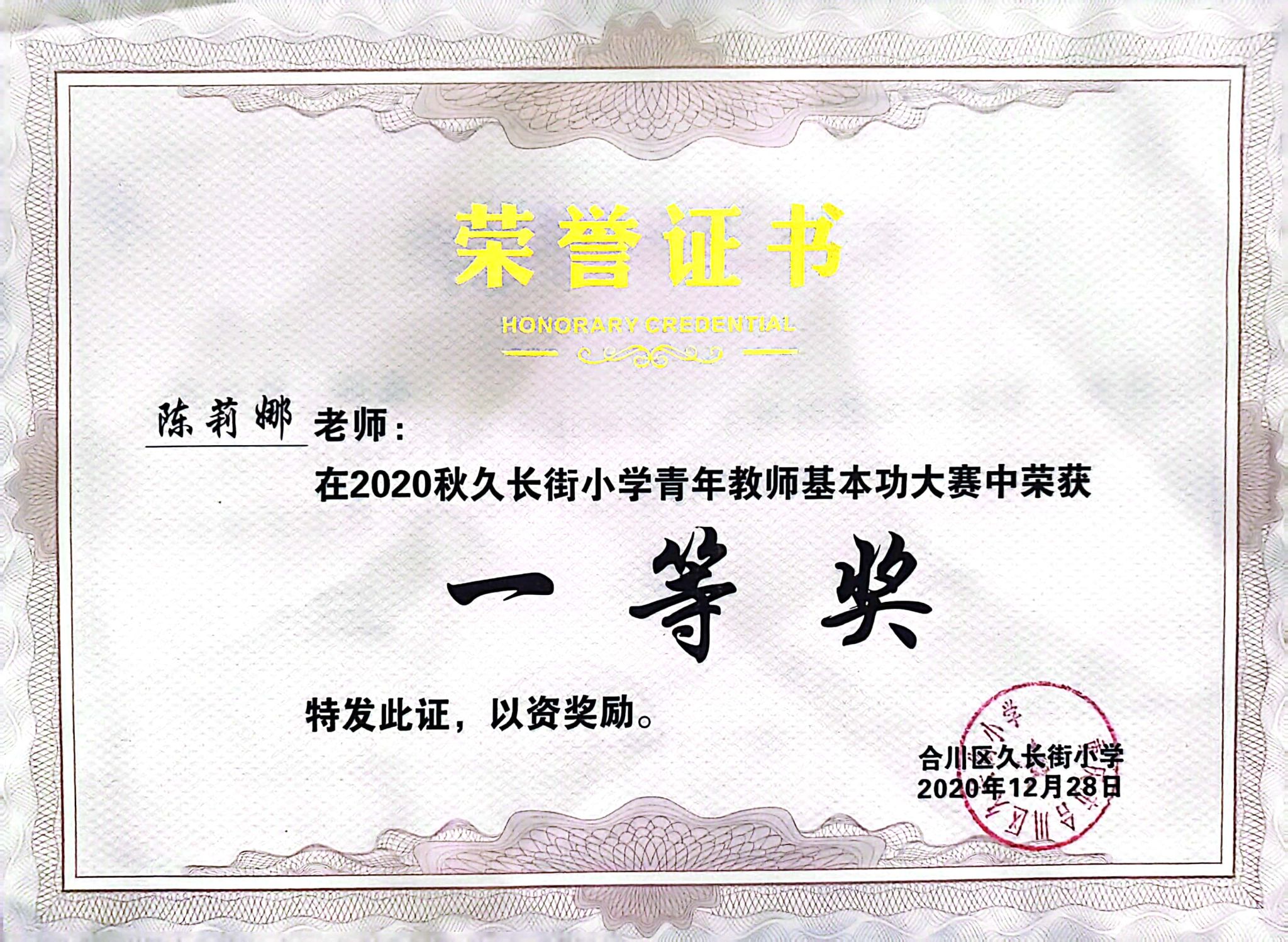 图为陈莉娜老师获奖证书