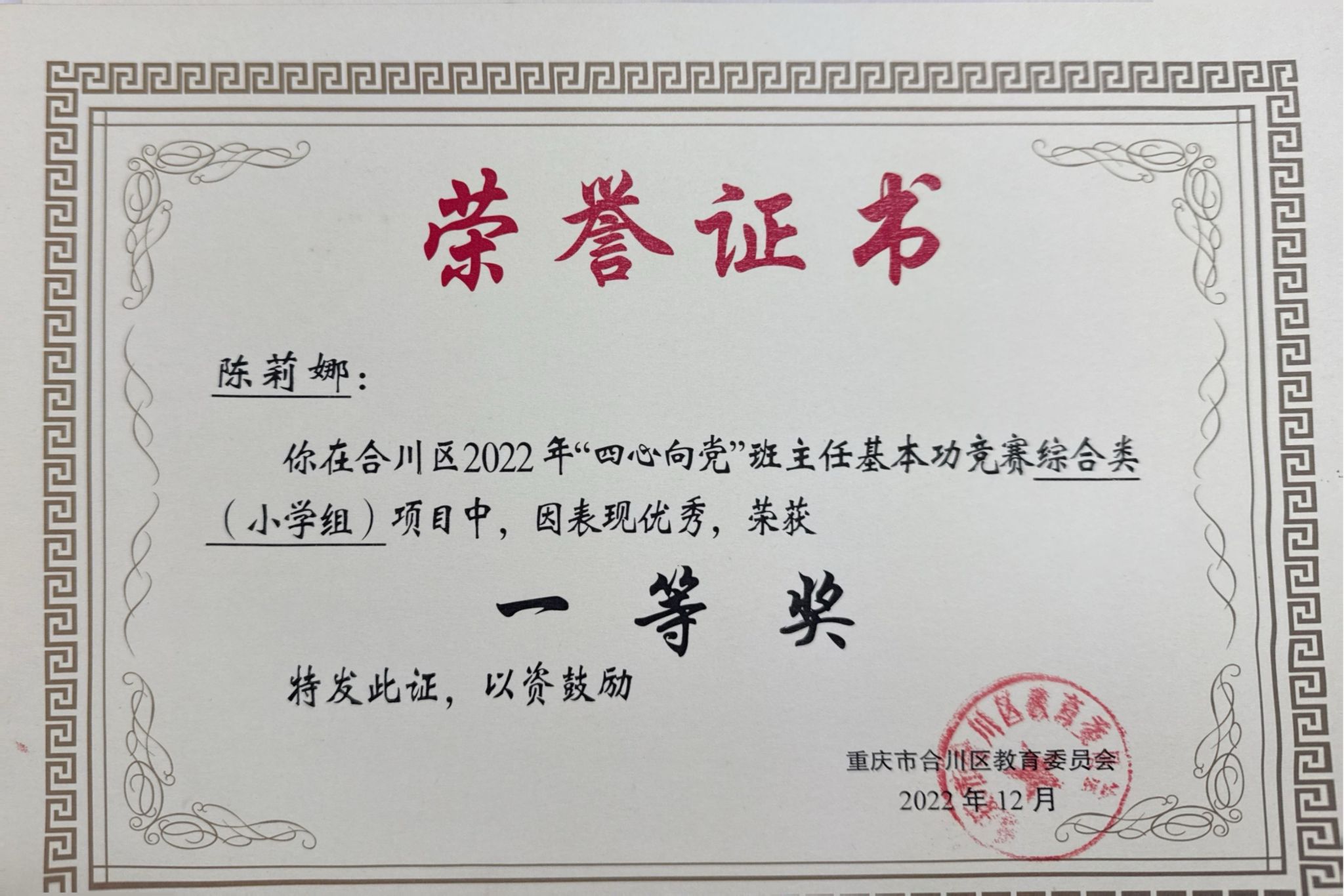 获重庆市第十届中小学班主任基本功竞赛小学组全能二等奖、主题班会活动二等奖;合川区"四心向党"中小学班主任基本功竞赛综合类一等奖等区级奖项9项、校级奖项3项。获重庆市第十四届、十五届基础教育课程改革征文大赛三等奖、二等奖。